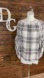 Fever Off Shoulder Blouse. Elastic Top. Ruffle Trim. Ruffle Bell Sleeves. Open Split Sleeves. Plaid Pattern. Slight High Low Hemline. White, Black, Light Pink Colors.