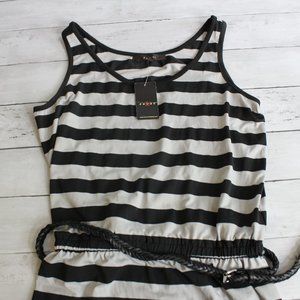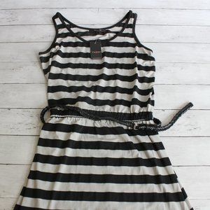 This long casual maxi dress is black and gray with stripes. It is sleeveless with a scoop neck, elastic waist with adjustable black belt and side slits on the skirt of the dress. It is brand new with tags.