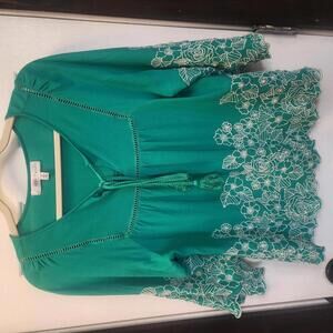 Fever Women's Green/Teal Floral Embroidery Top w/ scalloped edges-Size Small