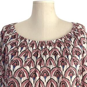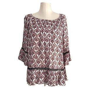 Peasant top by Fever features a charming ruffled design and 3/4 sleeves. Tunic/peasant-style top, comfortable fit, lightweight.