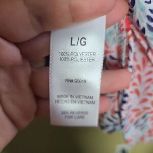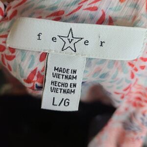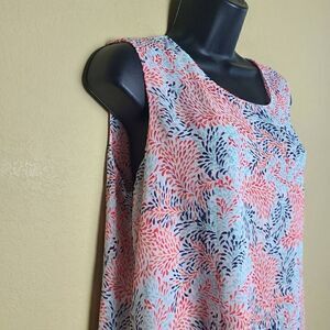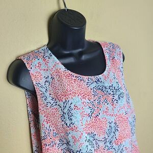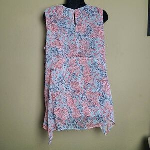 This is a layered tank top by Fever. It has red and blue swirl detail printed all over. On the back is a keyhole opening which is closed with a small button.
