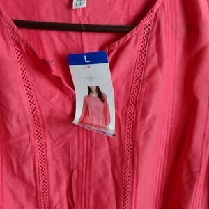 salmon colored rayon tunic with empire waist,. pit to pit 24" length 27". OO