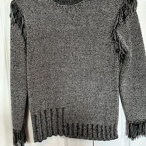 Fia Italia hand loomed black and white knitted scoop neck sweater with fringe around the arm holes and cuffs. Soft, cotton blend and very trendy and unique. Size small (S) with approximate measurements: 19 inches pit to pit, 25 inches shoulder to hem, and 22 inch sleeve. Very good preowned condition with no noticeable stains, tears or imperfections.