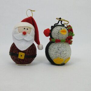Christmas Santa Claus and penguin night light ornaments with changing and flashing blue and red colors. Made of soft felt and spun soft acrylic. Each is approximately 4" tall and 2.5” wide.