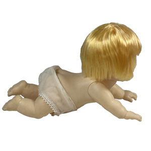 Fibre Craft Crawling Baby Doll 3079 Blue Sleepy Eyes Blond Vintage 7 in Long. Eyes close when laid down. Doll is naked with sheer underwear on. Clean pre-owned condition. This doesn't appear to have been played with - perhaps kept for a doll craft project. There is a dark spot on the chest area. Otherwise, no issues. Eyes move well and hair is clean. No original packaging. Review photos carefully for all details.