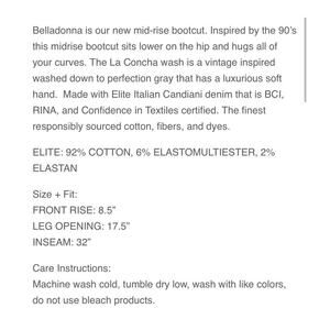 Belladonna is our new mid-rise bootcut. Inspired by the 90’s this midrise bootcut sits lower on the hip and hugs all of your curves. The La Concha wash is a vintage inspired washed down to perfection gray that has a luxurious soft hand. Made with Elite Italian Candiani denim that is BCI, RINA, and Confidence in Textiles certified. The finest responsibly sourced cotton, fibers, and dyes.
