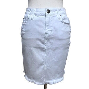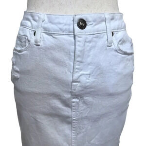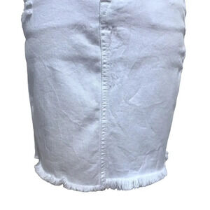 NWT. White Jean Mini Skirt for Women Size 25. Zipper and button for closure, 5 pockets design, has loops, distressed, frayed bottom hem, seam design middle front and back, "Fritz" Collection. Top and necklace are not included. Pictures are part of description.
