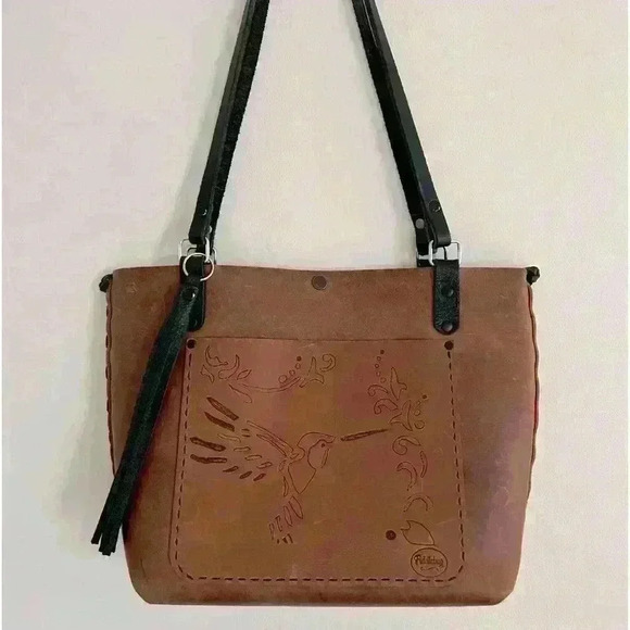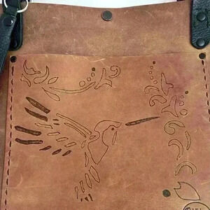 Beautiful full grain unique leather tote. 3 pockets. Burned Leather hummingbird