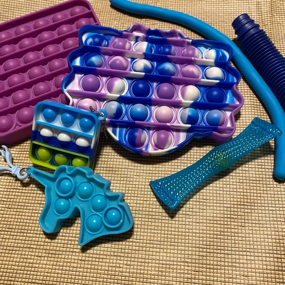 7 piece gently used fidget pack Marble mesh Monkey noodle Pop tube Mini pop it Mini unicorn pop it Bar pop it Purple square pop it