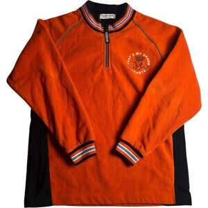 Bright orange long sleeve pullover with striped rib knit collar and cuffs, black side panels, and half zip front with Fido Dido zipper pull. Features “That’s My Brand Sports” chest embroidery and large “Fido Just Cool” graphic on the back. Excellent condition for its age.
