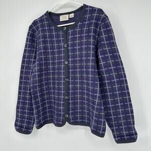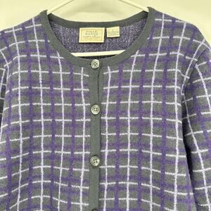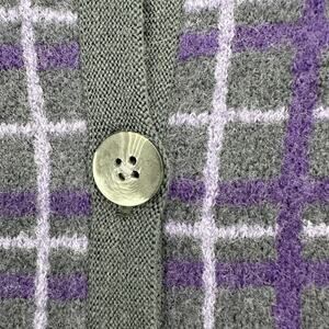 Field Manor Sweater Womens Large Purple Gray Plaid Merino Wool Button Cardigan
