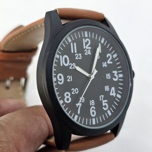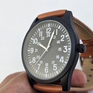 Field Men's Watch 42MM Easy Read Black Dial Black Case Brown Leather Band Straps