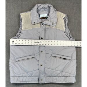 Vintage Fieldmaster men's puffer vest in size L. Features a light gray shell with contrasting corduroy shoulder panels, snap button front, and insulated lining for warmth. Classic outdoorsman look, perfect for hiking, camping, or layering in colder weather. Great vintage condition with minimal signs of wear. Please see photos for measurements.