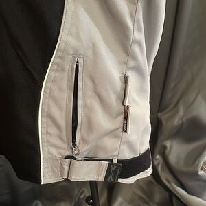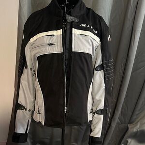 Stylish and durable Unisex riding jacket in black and gray. Perfect for versatile wear and comfort. Mesh lined, protected double zipper. Tons of pockets. Needs new armor if wanted…