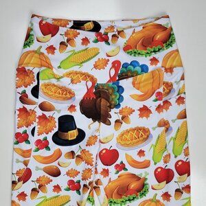 Fiercepulse women's Thanksgiving Turkey Holiday Leggings. Size L. White with multi-color Thanksgiving print. High Rise. Side cargo pockets. Smooth, stretch material.