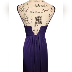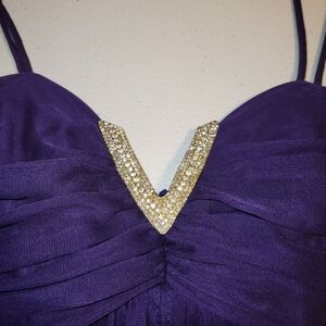 Stunning spaghetti strap purple dress featuring a sparkling silver and rhinestone accent.