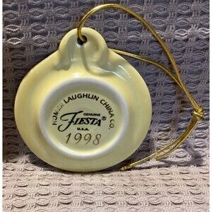 The Fiesta Homer Laughlin Dancing Lady 1998 Yellow Plate Shaped Christmas Ornament is a unique and collectible decorative piece made of stoneware and ceramic. With a vibrant yellow color and a glossy finish, this ornament features a contemporary design inspired by the Fiesta brand. Crafted in the United States using pottery production techniques, this vintage ornament is a charming addition to any Christmas decor, showcasing the intricate Dancing Lady pattern from 1998.
