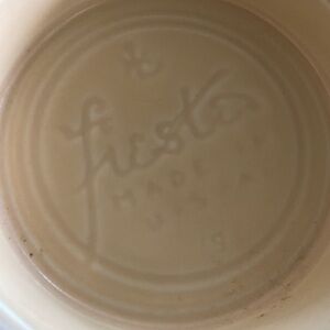 Fiesta casserole only made for 2 years in early to mid 1900’s. Color is ivory to pale yellow . This is a rare piece. It is in good condition, has one tiny chip- check photo with ruler, I had never noticed it until I took the photo. A touch of paint would cover it. The handles are fabulous