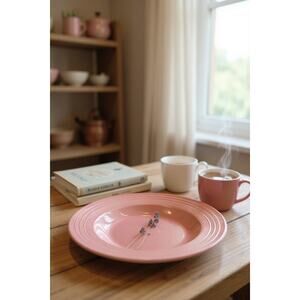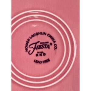 Iconic concentric rings and a soft rose-pink glaze make this 12" Fiesta serving dish a standout for display or daily table styling. Made by the Homer Laughlin China Co. in Newell, West Virginia, it reflects the beloved Art-Deco-born Fiesta line relaunched in 1986. The color appears to be Rose, introduced in 2005 and retired in 2008, making it a short-run modern classic. The underside stamp reads “Genuine Fiesta HLC USA … Lead Free,” with factory/date letters consistent with mid-2000s production. Perfect for cottage, retro, and colorful maximalist kitchens—use as a charger, fruit dish, or wall display. Measures 12" diameter x 1.75" high.