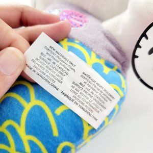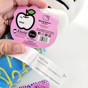 This Fiesta piece is a part of their line of Sanrio stuffed animals and toys. It is a 2022, Sanrio Hello Kitty Mermaid Kitty with a blue and yellow tail, pink and rainbow tail end and matching bow, purple top, and applique heart with shells on the chest. It also has it's original paper tags. An adorable addition to any Sanrio collection!