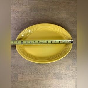 This daffodil yellow (I believe) serving platter from Homer Laughlin's Fiesta line is a fantastic addition to any collection of decorative cookware, dinnerware, and serveware. Measuring 13.5 inches in length and 9.5 inches in width, this ceramic platter features an oval shape that makes it perfect for serving up your favorite dishes.