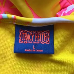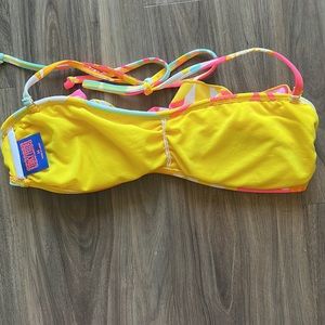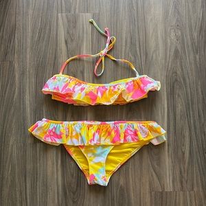 Ultra feminine ruffled bandeau halter style top with removable spaghetti straps and hook back closure. Bottom has ruffle around waist and full coverage back with high cut legs. EUC with no visible fading or pills. Bright pink, gold, yellow and turquoise floral print. Please refer to photos as they are a part of the description.