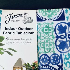 NWT Fiestaware blue and teal green print indoor / outdoor fabric tablecloth. Solid white background. Water repellant, wipes clean for easy care, coordinates with Fiesta dinnerware colors. 60”x 84” oblong / rectangular, seats 6-8. May have multiple sizes available, please ask!