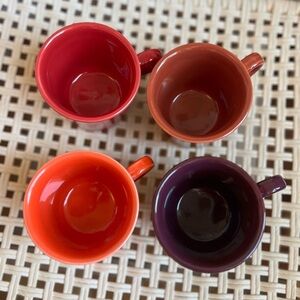 Fiestaware mugs set of 4, Fiesta HLC USA 10 oz coffee cups, vintage Fiestaware replacement mugs, colorful ceramic stoneware kitchenware, red orange persimmon plum mugs, retro Fiesta pottery, collectible HLC dinnerware made in USA