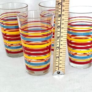 Fiestaware Multicolor Red Yellow Blue Stripe Water Tumbler Drink Glass Set of 4 Good preowned condition Tags: Primary colors, Retro, movie tv sitcom set prop, juice, beverage, MCM, Mid century modern, vintage, colorful, vibrant, gathering, hosting, serve ware, cups, collectible, drink ware