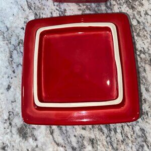 This scarlet Fiestaware candy dish with lid is in MINT condition. Add to your collection or replace an item you've lost. Produced somewhere between 1996 and 2020; cannot determine exact age. No box. Measures 2.25" high (with lid, measurement is ~4"); 2.5" base; 4" square mouth.