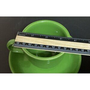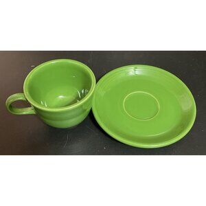 This Fiestaware Shamrock Green Teacup Saucer is a contemporary 2013 model made in the USA. Made of sturdy ceramic, this plate-mug combo is perfect for tea lovers and Fiestaware collectors alike.