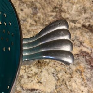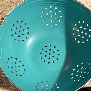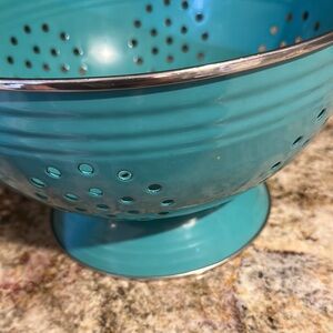 Vibrant turquoise colander. Perfect for straining pasta or washing vegetables. Durable and stylish design.