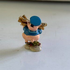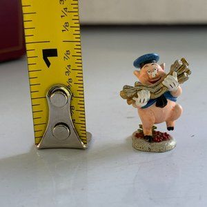 The collectible miniature figurine of Fifer Pig wearing a blue cap and shirt, carrying wood or straw, and standing on red flowers or berries by his feet is a part of the 3 little pigs enchanted places miniatures set. It comes with a certificate of authenticity and original box from the late 1990s and stands about 1" tall.