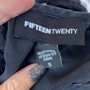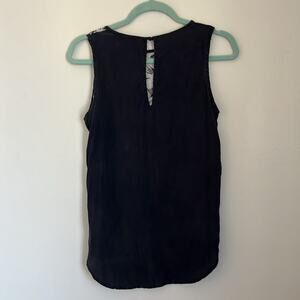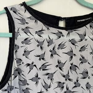 Fifteen Twenty sleeveless 100% silk tank. High scoop neck and keyhole button closure back. Front fabric has a sparrow print. Back is solid. Size S