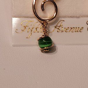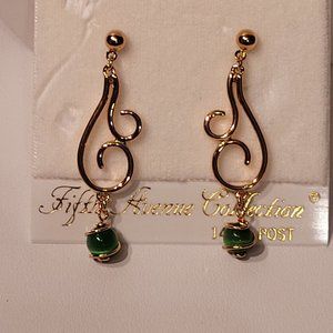 Fifth Avenue Collection jewelry - Gold swirl dangling earrings with a green bauble 14KT earring posts