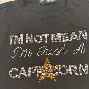 Black tee with 'I'm Not Mean I'm Just A Capricorn' and star graphic.