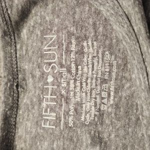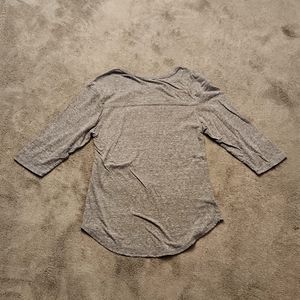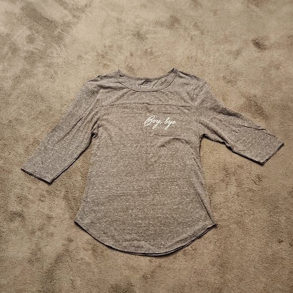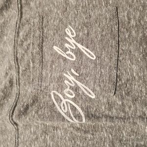 Gray three quarter sleeve top with "Boy, Bye" inscribed on the front pocket