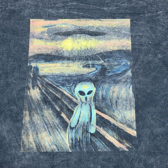 Fifth Sun LS Crop Tee "The Scream" UFO Graphic - Size Large. There are 2 light spots under the graphic on the front, as well as 1 spot on the back. Not sure if it was a manufacture flaws. See the last 3 pictures. Comes from a smoke free home.