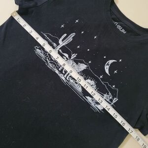 Explore your world in adventurous style with this women's Fifth Sun black tee. This trendy and stylish crewneck has short sleeves with howling wolf graphic front design. It's a fun top with white or black denim. Excellent, new condition.