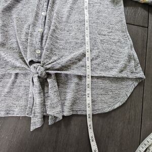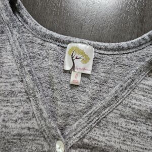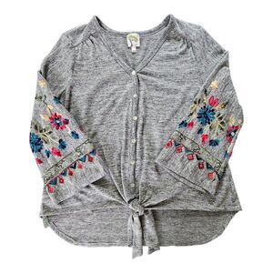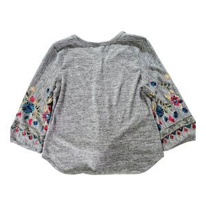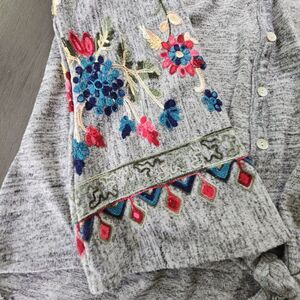 The Fig and Flower Anthropologie Tie Front Embroidered Sweater in size L is a stylish and cozy addition to any boho or hippie-inspired wardrobe. This gray sweater features a floral pattern, tight-knit fabric, and 3/4 bell sleeves for a trendy look. The V-neckline and relaxed fit make it comfortable for all-day wear, while the embroidered accents add a touch of bohemian charm. Perfect for the winter, fall, or spring seasons, this cardigan from the Fig and Flower brand is sure to become a favorite versatile piece in your closet. See pictures for measurements