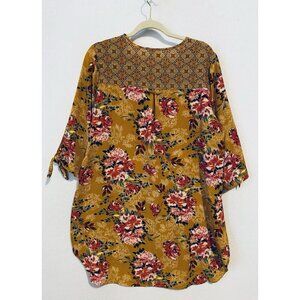 Fig And Flower Anthropologie Top Womens XL Yellow Red Floral Tunic Tie Cuff Boho