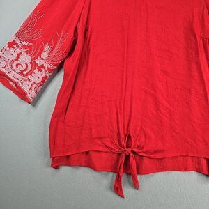 Elevate your wardrobe with the Fig & Flower tunic blouse, a piece that marries comfort with effortless style. Featuring an alluring red hue complemented by intricate floral embroidery, this top is a celebration of feminine design. The relaxed fit and 3/4 bell sleeves offer a fluid silhouette that's both flattering and playful.