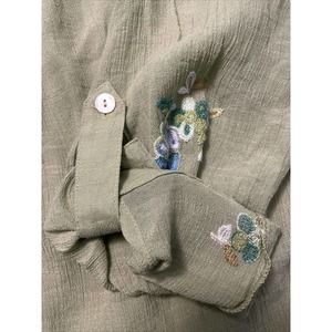 Absolutely beautiful green sheer with embroidered floral, button front, roll tab sleeves, Clean, great condition,