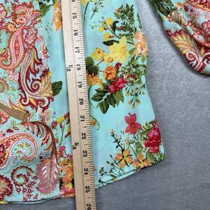The Fig & Flower Anthropologie Floral Boho Peasant Blouse Top in size S is a vibrant and colorful piece perfect for summer, fall, and spring. This blouse features a V-neckline, 3/4 sleeves with raglan sleeves, and a button closure. Made of 100% polyester, this lightweight top is great for travel, parties, or casual wear. The paisley pattern adds a touch of bohemian flair to this basic yet stylish piece from the brand Figueroa & Flower. Ideal for women looking for a regular fit with a whimsical and colorful theme.