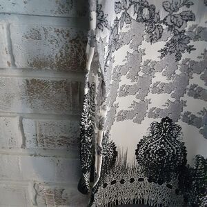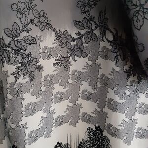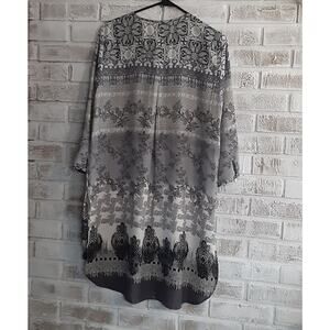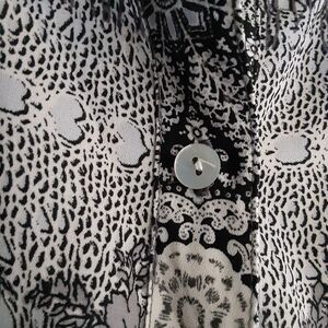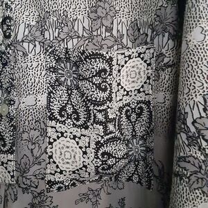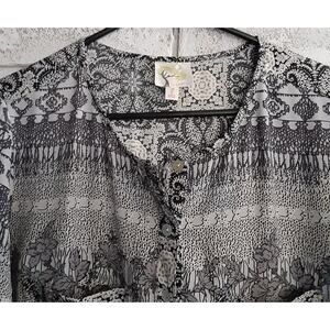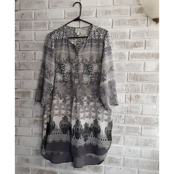 This beautiful tunic by Fig & Flower Anthropologie is a must-have in your wardrobe. It comes in size L with an abstract and floral pattern in shades of grays, white, and black. The lightweight fabric makes it perfect for any season, and it features oyster shell buttons, split sides, and a rounded hem. The hi-low dress length adds a touch of elegance to the overall design. This tunic is ideal for any casual occasion, and its style and theme are perfect for women who love flowers. It is a versatile piece that can be dressed up or down, making it suitable for a range of different events. Get your hands on this gorgeous tunic today and add it to your collection.Approximate measurements: under arms-44" length-32.5-38" 2 breast pockets & 1/4 button up