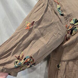Fig & Flower Flowy Brown Dress Size Large Embroidered Paisley Sea Shell Buttons