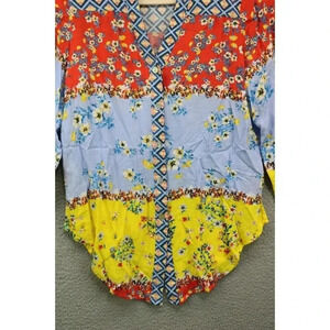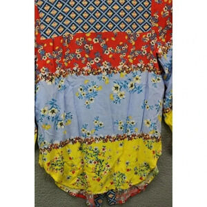 This is a Fig & Flower Long Sleeve Button-Up Floral Blouse that is a size Petite Small. It is 100% Rayon. Laying flat, it measures: Armpit to armpit-19.5" and the length is 26". It is in good condition. Very colorful and Boho.