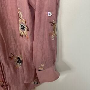 Fig & Flower Pink Blouse S Floral Embroidered Roll Tab V Neck Button Front