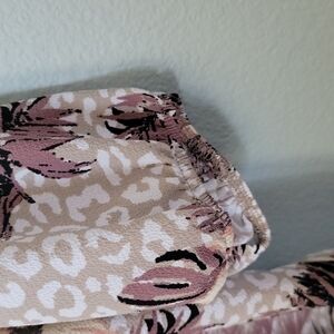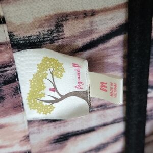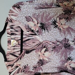 Has a leopard / cheetah/ animal print mixed with a tropical floral pattern. Leaves look like palm leaves that are a mauve color. Flowers are pink and the background is tan and white. A unique color combo on my opinion. The back has a large boho pattern on the upper to mid back. Split neck and button detail halfway down the chest. Textured fabric, doesnt stretch. Elastic at the end of each sleeve. 3/4 sleeves. Great condition. no fabric tag. Boho, hippie, office, workplace, church, brunch, unique, statement