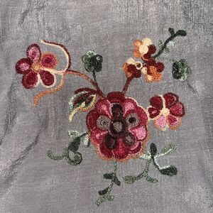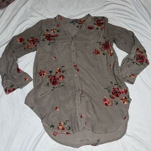 Fig & Flower Top Blouse S Small Taupe Embroidered Floral Roll Tab Sleeve 3A